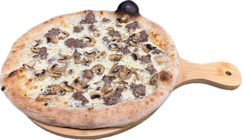 Crème fraîche, mozzarella Fiore di latte, champignons, viande haché, olives origan.