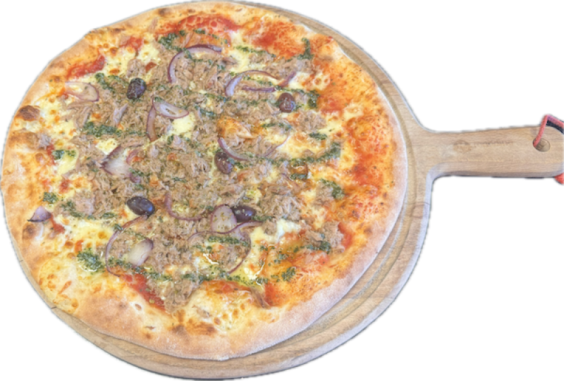 Tomate, mozzarella Fiore di latte, thon, oignons, persillade maison, olives, origan.