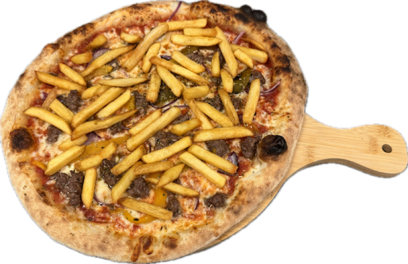 Tomate, mozzarella Fiore di latte, viande hachée, poivrons, oignons, frites, origan.