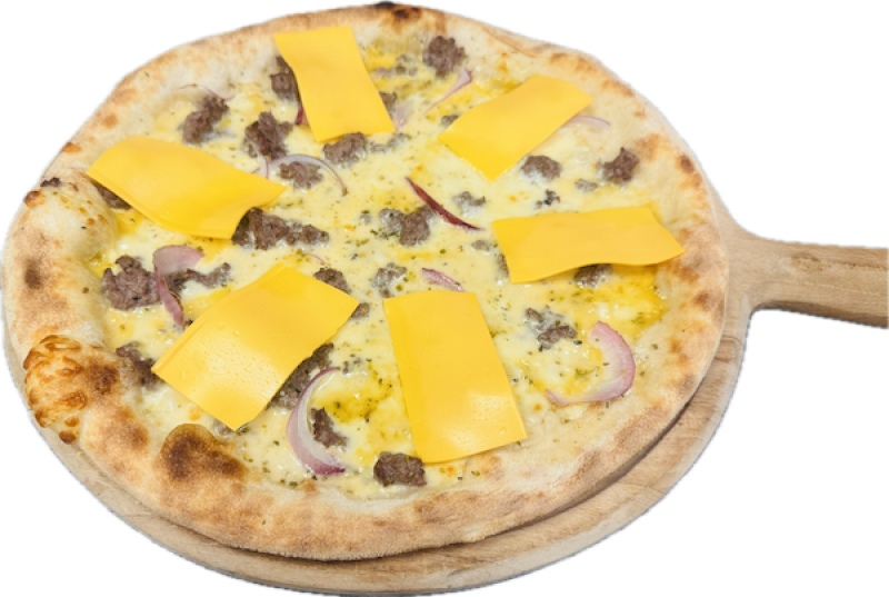 Sauce Buger, mozzarella Fiore di latte, viande hachée, oignons frais, cheddar.