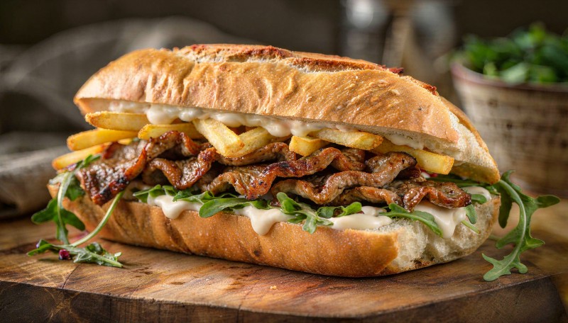 Pain maison, kebab, salade, tomates, oignons frais, frites et sauce au choix.