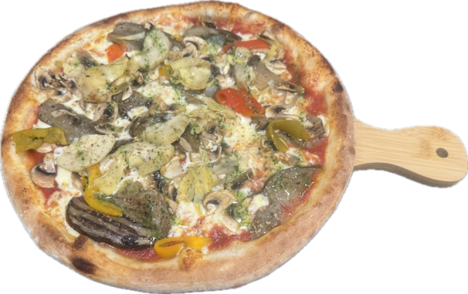 Tomate, mozzarella fiore di latte, aubergines, poivrons, champignons, artichauts, origan, persillade.