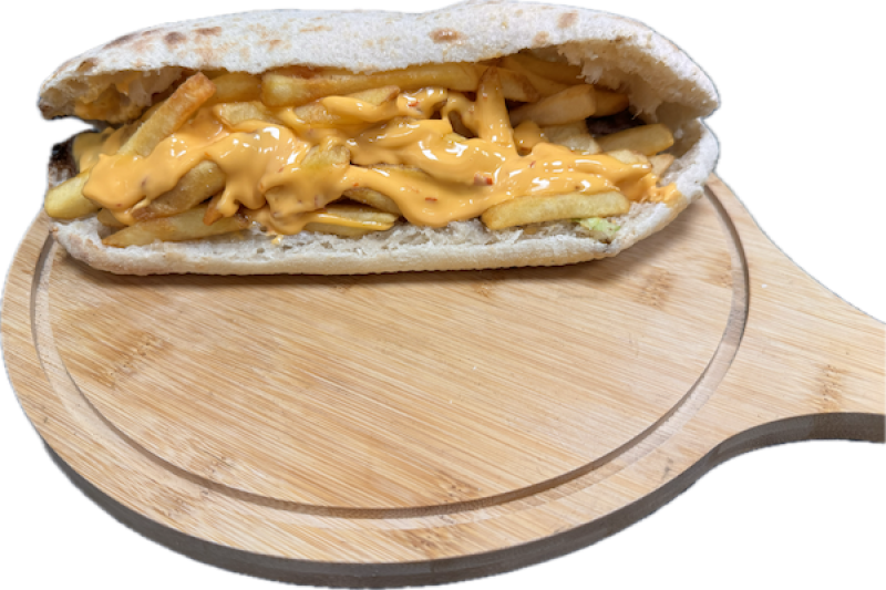 Pain maison, merguez, salade, tomates, oignons frais, frites et sauce au choix.